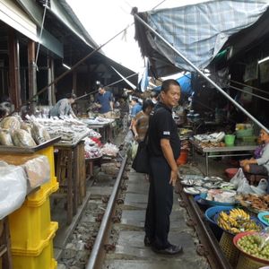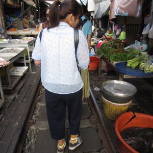線路に市場?日本では全体にないメークロン市場を楽しみにして行ってきました。想像していた観光客に見せる市場ではなく、本当に現地の人たちが毎日の生活のためにここで買い物しているんだなぁと実感しました。売ってる物も日本では到底考えられない食べ物が多く、改めて国によっての食文化の違いを知りました。そして、毎日朝8時30分ごろ列車が通り、線路上の品物があっという間に片付けられ、またそれが列車が通り過ぎた後には何事もなかった様に並べられて売られている光景は本当に驚かされました。その後に行った水上マーケットは今回で3回目でしたが、舟に乗りながら売っている物を見たり買ったりするのも日本にはないので何回行っても楽しめます。ただ食べ物はなかなか手がでませんが・・・ 市場の後に最後に連れていってもらったラーメンはすごくおいしかったです。日本でもなかなかこんなおいしい(あっさり系かな?)のはないですね。場所ははっきりとはわからないですが、次回タイに行った時にももう一度食べたいです。