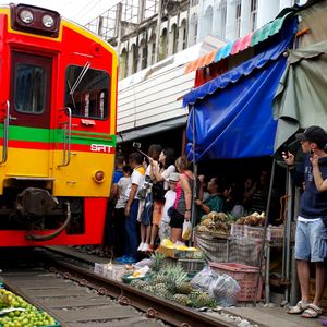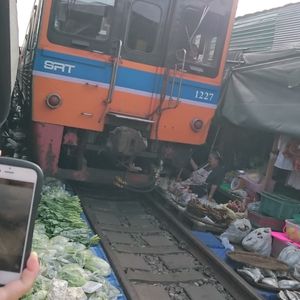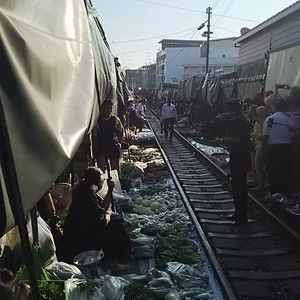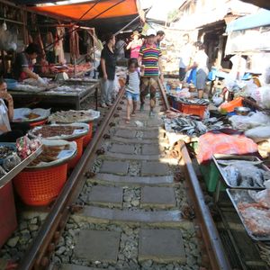 バンコクから西へ70kmに位置するメークロン線の終着駅(メークロン駅)へご案内します。このメークロン駅の名物は、何と言ってもこれしかありません…列車運行中の線路上で開かれている驚愕の市場!