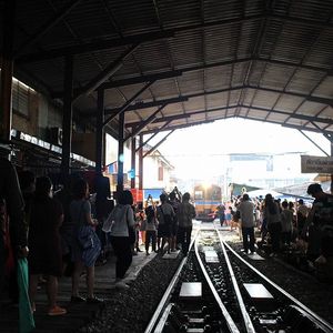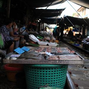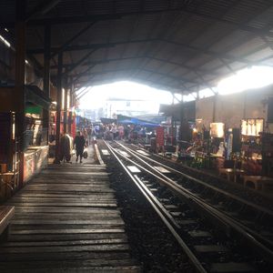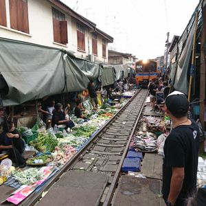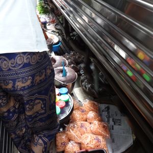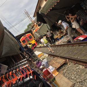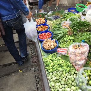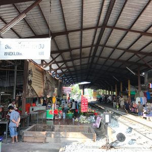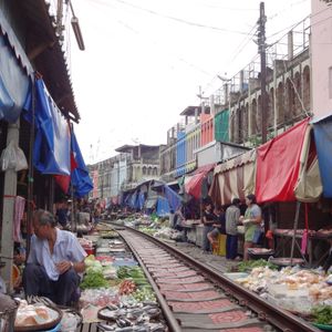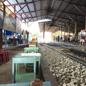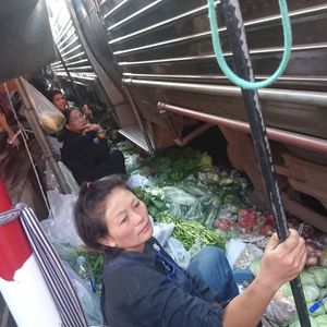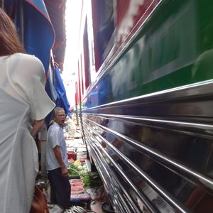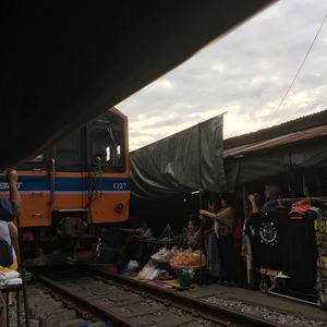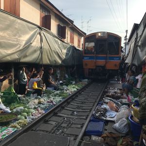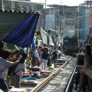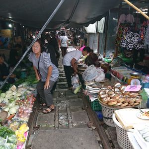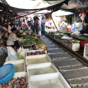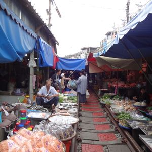線路市場メークロン+水上マーケット(ダムヌンサドゥアック)<午前/日本語ガイド/タイラーメン昼食付>に参加しました。線路市場メークロンではテレビで見た通りの大迫力?と言うより危ないと思ったのが自身の感想です。案の定、早朝より各国の方々が見学に訪れて大賑わいの市場でした!写真撮影ですが踏切付近では大混雑で撮影どころではありません!鉄道ファンであれば早めに駅構内脇の茶屋でコーヒー、マンゴライスなど飲食しながら列車を見るのが良いポイントです何せテーブル擦れ擦れに列車の車輪が通りますよ必見です。