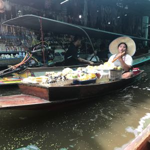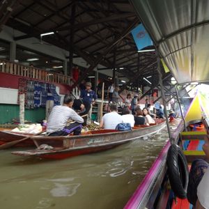 水上マーケットはまずエンジン付きのボートに乗車しますがガイドさんの指示に従いながらボート先端に乗船すれば大迫力です(先頭乗船不可能の場合があるらしい)次に有料の手漕ぎボートに乗船し買い物!(買い物は交渉で安くなる)有料なので希望者だけだが乗船しない人は居ませんよ!他にヤシの砂糖作り、タイラーメンで(辛めのスープがお勧めですノーマルは味が無し)終了です。道路が混雑していなければ14:00頃に帰れます(土日がお勧め)