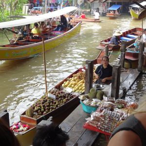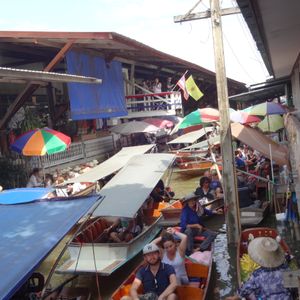 朝早くの出発で少々きつかったです。メークロン市場は、電車が近づいてくると商品を全部片付けるのかと思っていたら実際はテントをたたむだけで商品はそのままでした。電車が到着する8:30頃になると急に観光客が増えるので、早めに線路の上でカメラを持ってスタンバイした方がいいと思います。残念なのは水上マーケットで、オプションで200バーツ余分に払って小型ボートに乗ってみたものの、他の観光客のボートでいっぱいで運河が渋滞し、おまけに左右にずらりと並ぶ高い土産屋に何ヵ所も停泊してしつこくにせもののブランド品を薦められました。最初は小型ボートに乗るつもりはありませんでしたが、乗らないとボート乗り場のある土産屋で1時間ほど同じツアーのお客さんを待つ必要があり、乗りましたが、どちらにしても土産屋めぐりだったようです。またラーメンの軽食は、人気店との事でしたが特に混んでいない普通の食堂で、パクチーやもやしのトッピングもない、他の店のラーメンと比べても量の少ないもので、アイスクリームはいらないからもう1品おかずが欲しかったです。