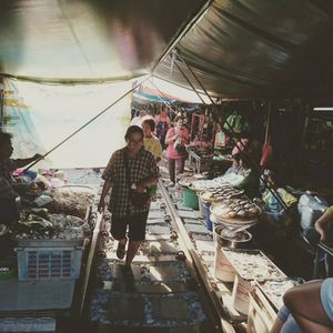 メークロン市場を見たかったので参加しました。大変人が多く混雑していましたが、線路に電車が行き来する間の市場の人たちの様子を見ることができました。