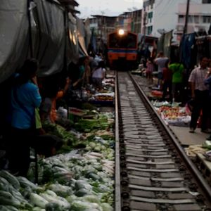 バンコクから西へ70kmに位置するメークロン線の終着駅(メークロン駅)へご案内します。このメークロン駅の名物は、何と言ってもこれしかありません…列車運行中の線路上で開かれている驚愕の市場!