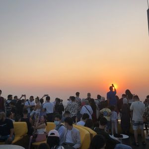到着した74階は屋内展望台なので安心して360°の眺望を楽しみ、エレベーターで78階の屋外ルーフトップへ。多くの外国人観光客が既にビール片手に日没の夕日を楽しんでいる。