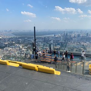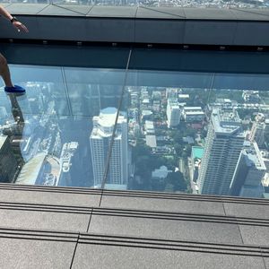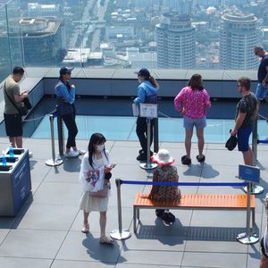 入り口で荷物検査とロッカーに荷物を預けて、チケットを見せてエレベーターで展望台へ。事前にチケットを購入していてスムーズでした。エレベーター内のデジタル映像に感動しながら74階に到着。展望台からの景色は素晴らしく、バンコク市内を一望できました。ガラス張りのトレーの上を靴に布製スリッパを被せて歩くと、スリル満点でした。トレー内は携帯電話を持って撮影できないので注意です。非常におすすめのスポットです。