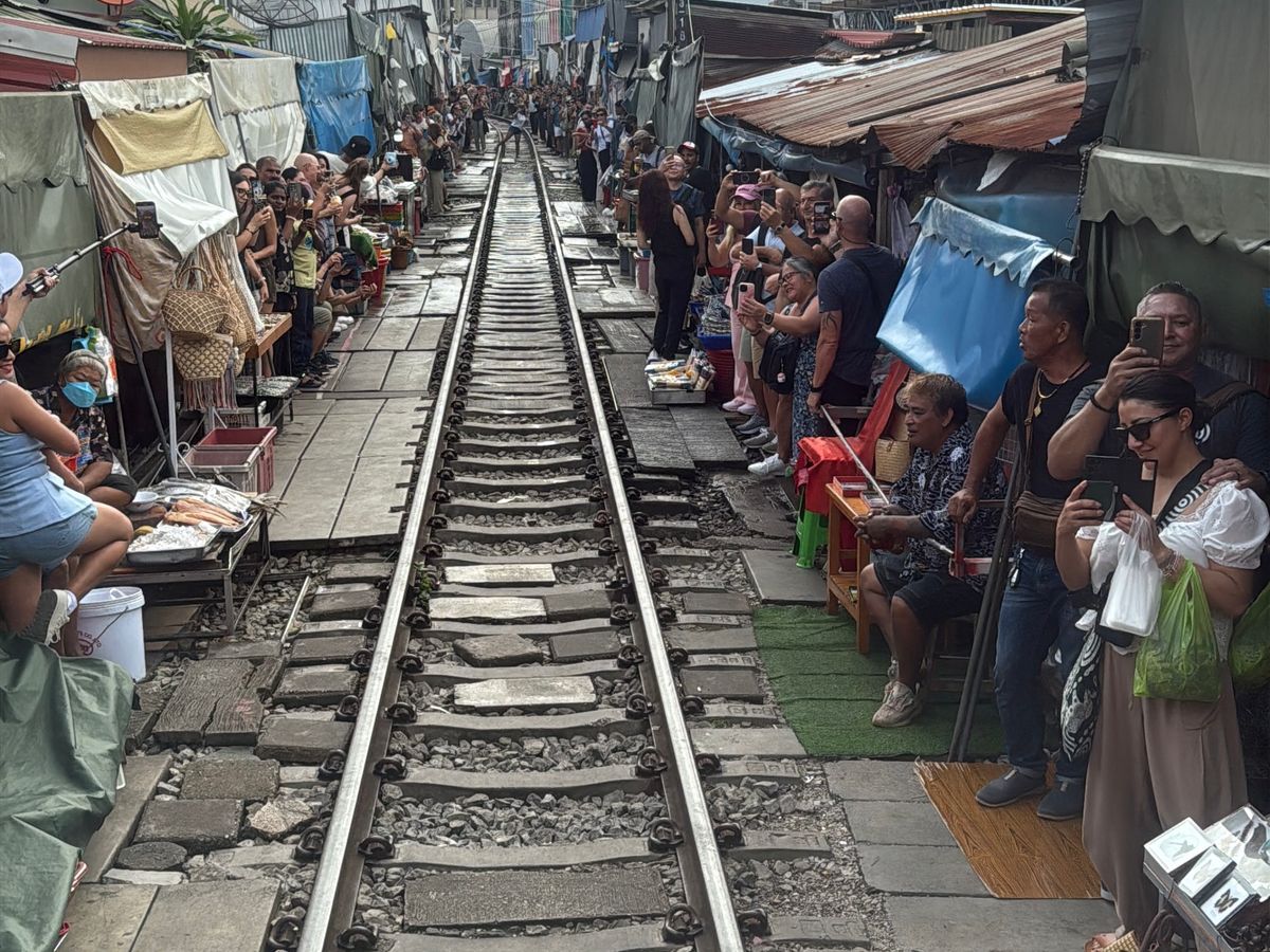 メークロン線路市場では目の前をゆっくりと列車が通り過ぎ、乗っている人と