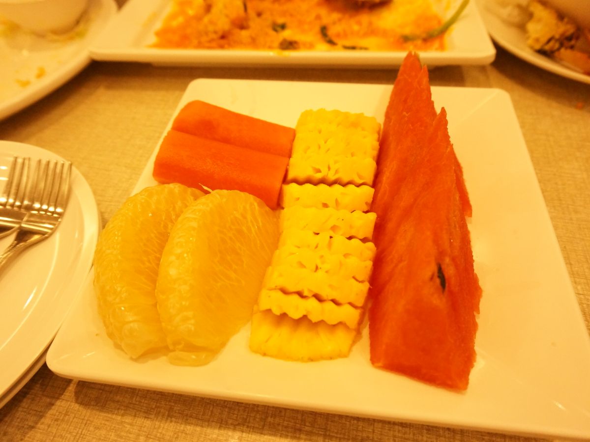 プーパッポンカリー、トムヤムクン!イカリング、空芯菜の炒め物、ご飯、フルーツの盛り合わせなど、男性二人でも食べ切れない量で大変満足のいくコースでした。