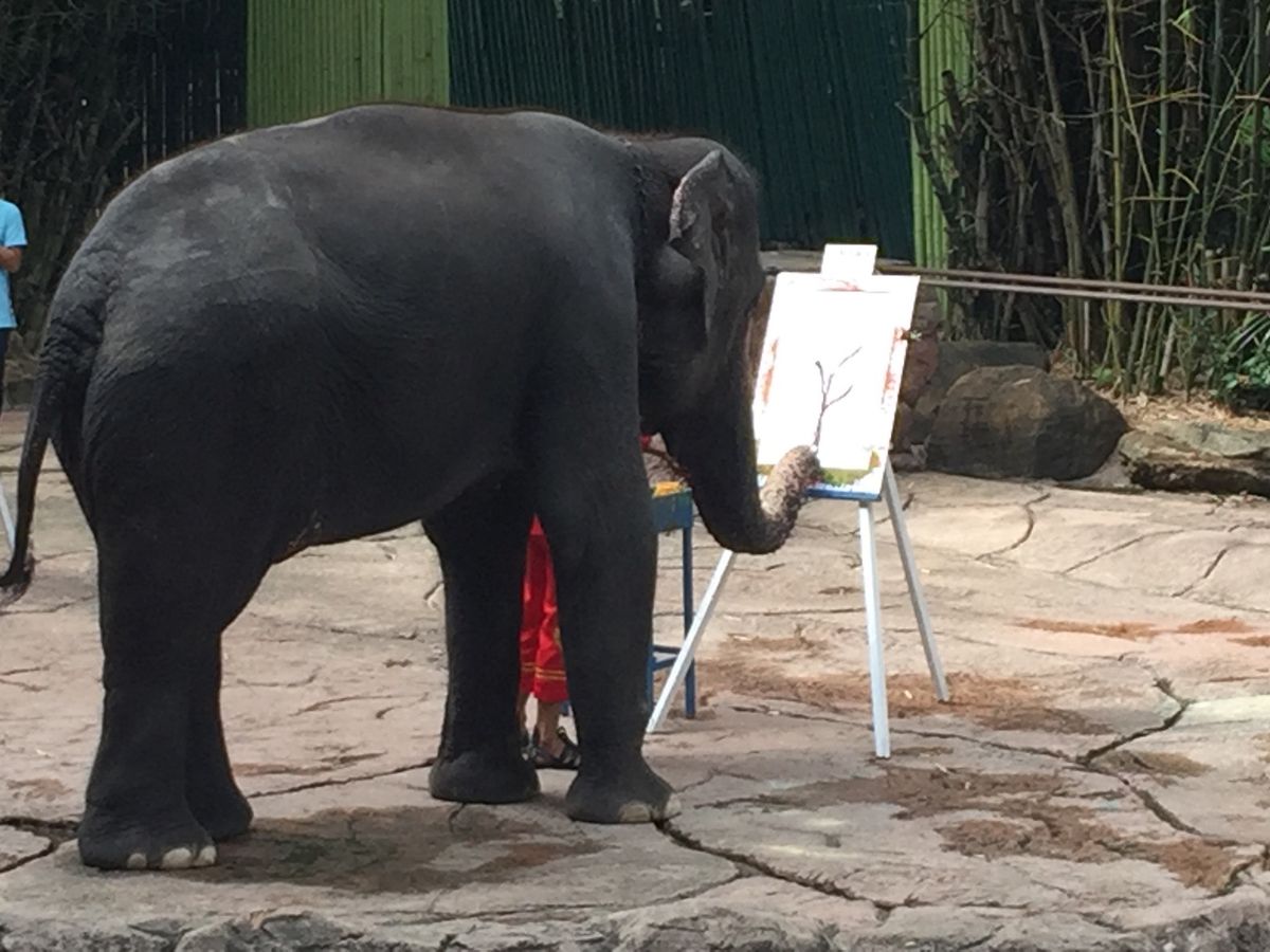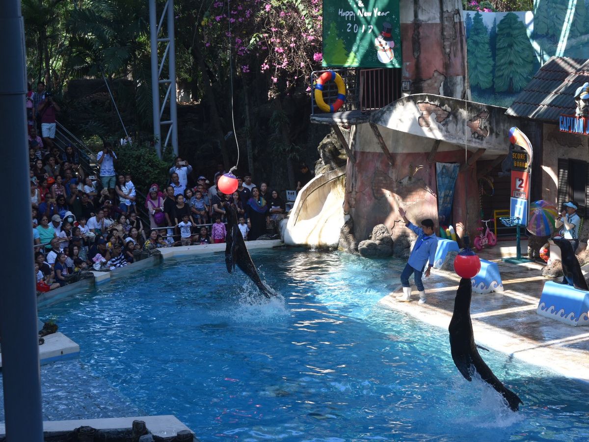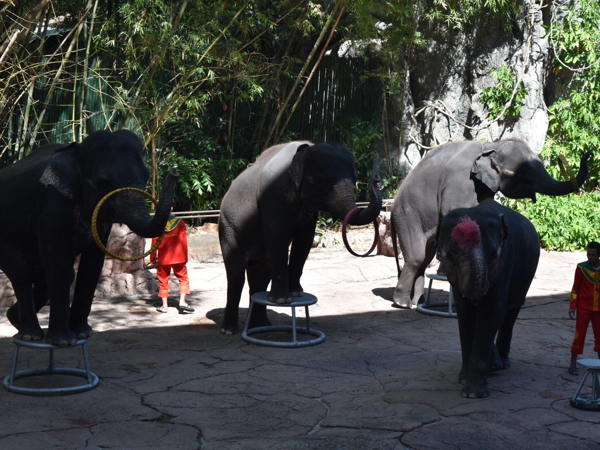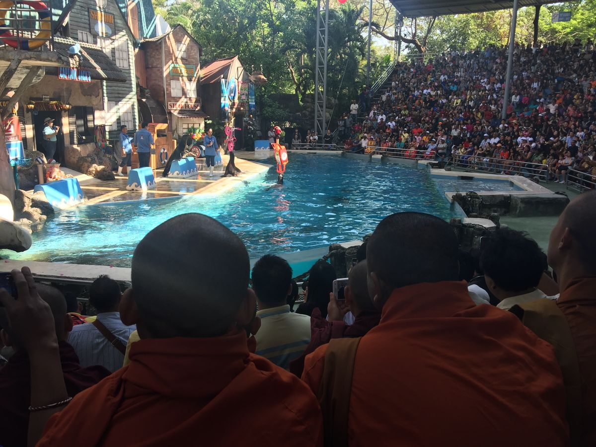 その後、マイクロバスから降りてマリンパークでショーを見ます。五つぐらいのショーがあり、まずアシカ・象・オランウータン・イルカを見ます。