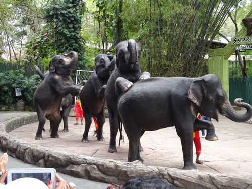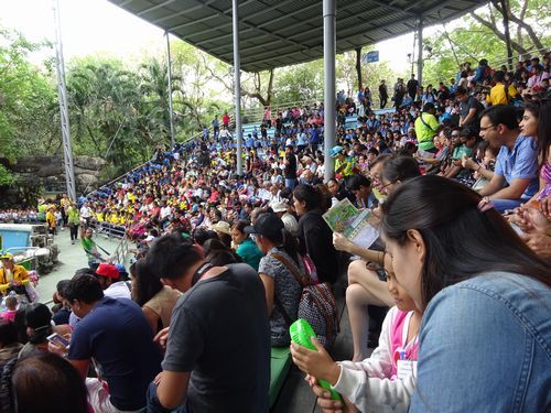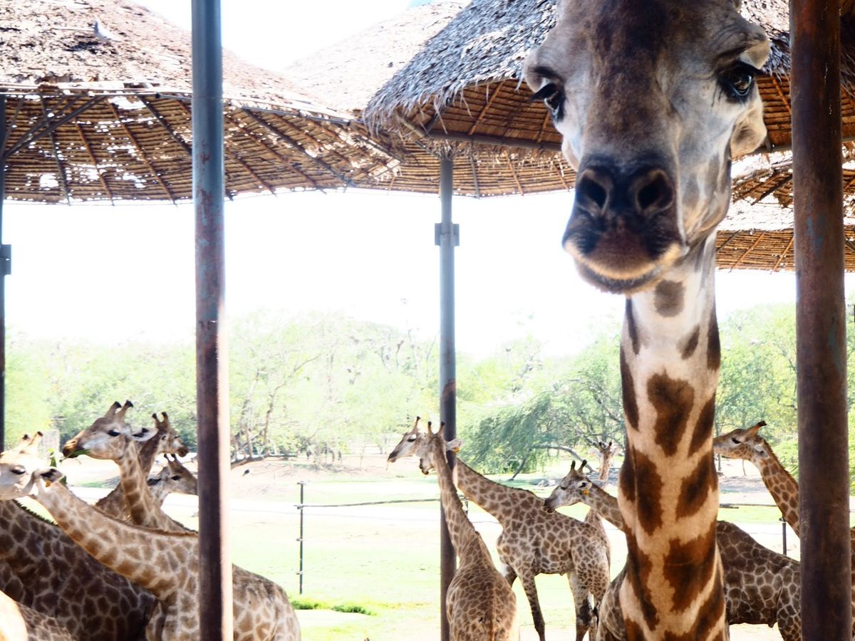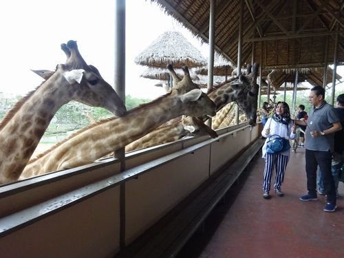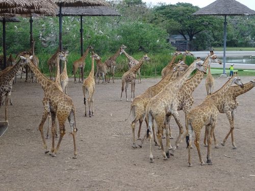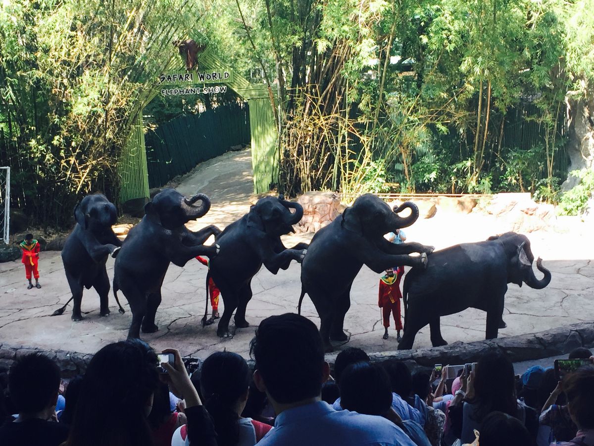 ①車でサファリツアー(9:00~9:40 ゆっくり移動してくれるので結構写真が撮れます)②アザラシのショー(11:00~11:20)③像のショー(11:40~12:00)④屋内の会場でビュッフェランチ(12:20~13:00大したものはありませんがタイ風ラーメンとアイスクリームは美味しくいただきました)⑤イルカのショー(13:45~14:05)⑥キリンの餌やり(14:20~14:50 これは日本では体験できないので一番お勧めです。とても沢山のキリンがいて大人でも楽しいです。餌は1バケツ100B)⑦スパイショー?(15:00~15:30 それなりに迫力もあり小芝居が笑えます)⑧鳥のショー(15:40~16:00)以上のようなスケジュールでした。ガイドのエーさんは園内を熟知しているらしく無駄なく誘導してくれますが疲れました。平日にもかかわらずあまりの人の多さにはビックリしましたがお寺に飽きた人、キリン好きな人、ファミリーにはお勧めします。
