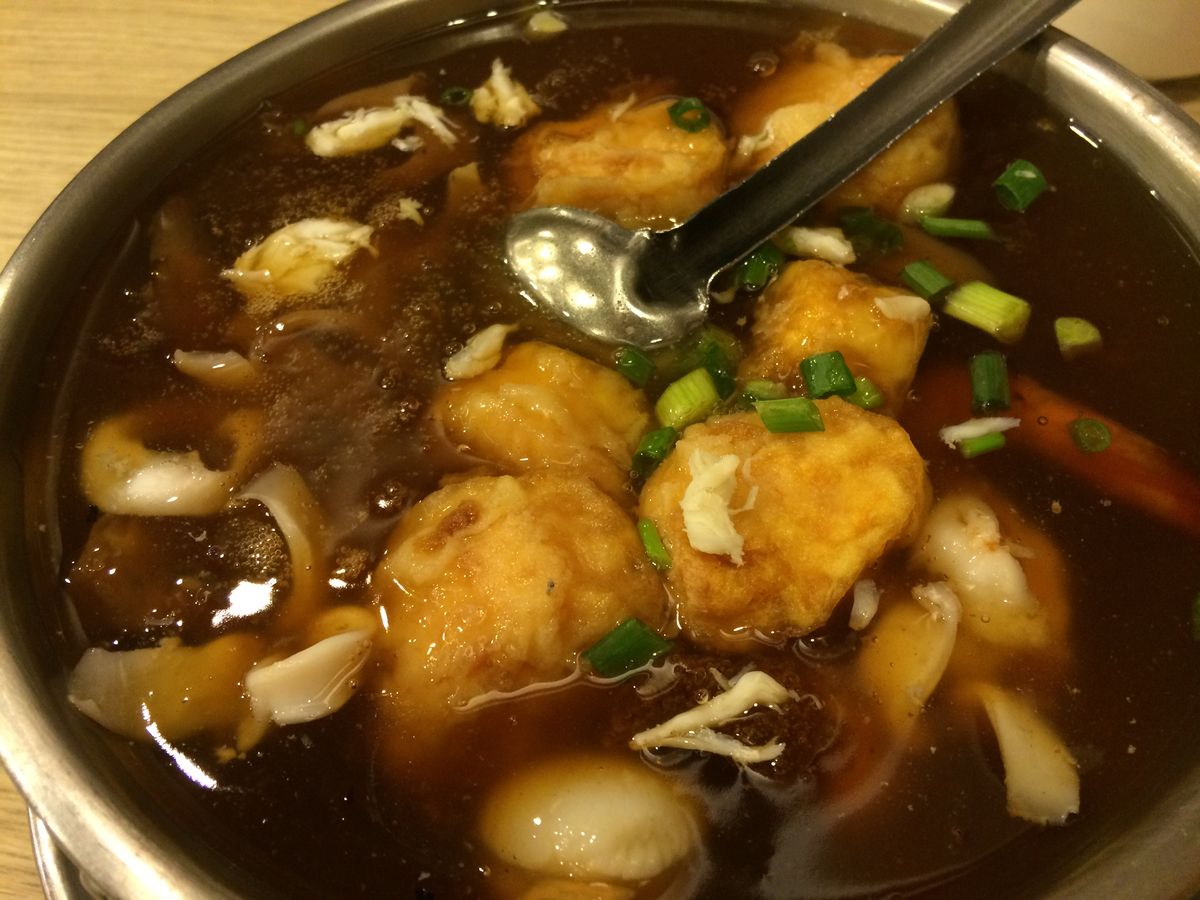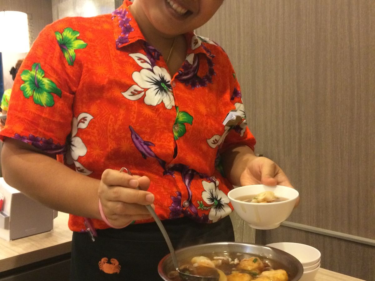 きのこと豆腐のとろみスープは目の前で温めて、スタッフが取り分けてくれました。さすがの名店、店内はローカルや中国系観光客で賑わっていました。