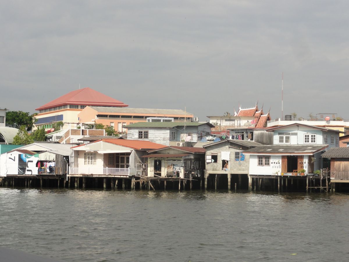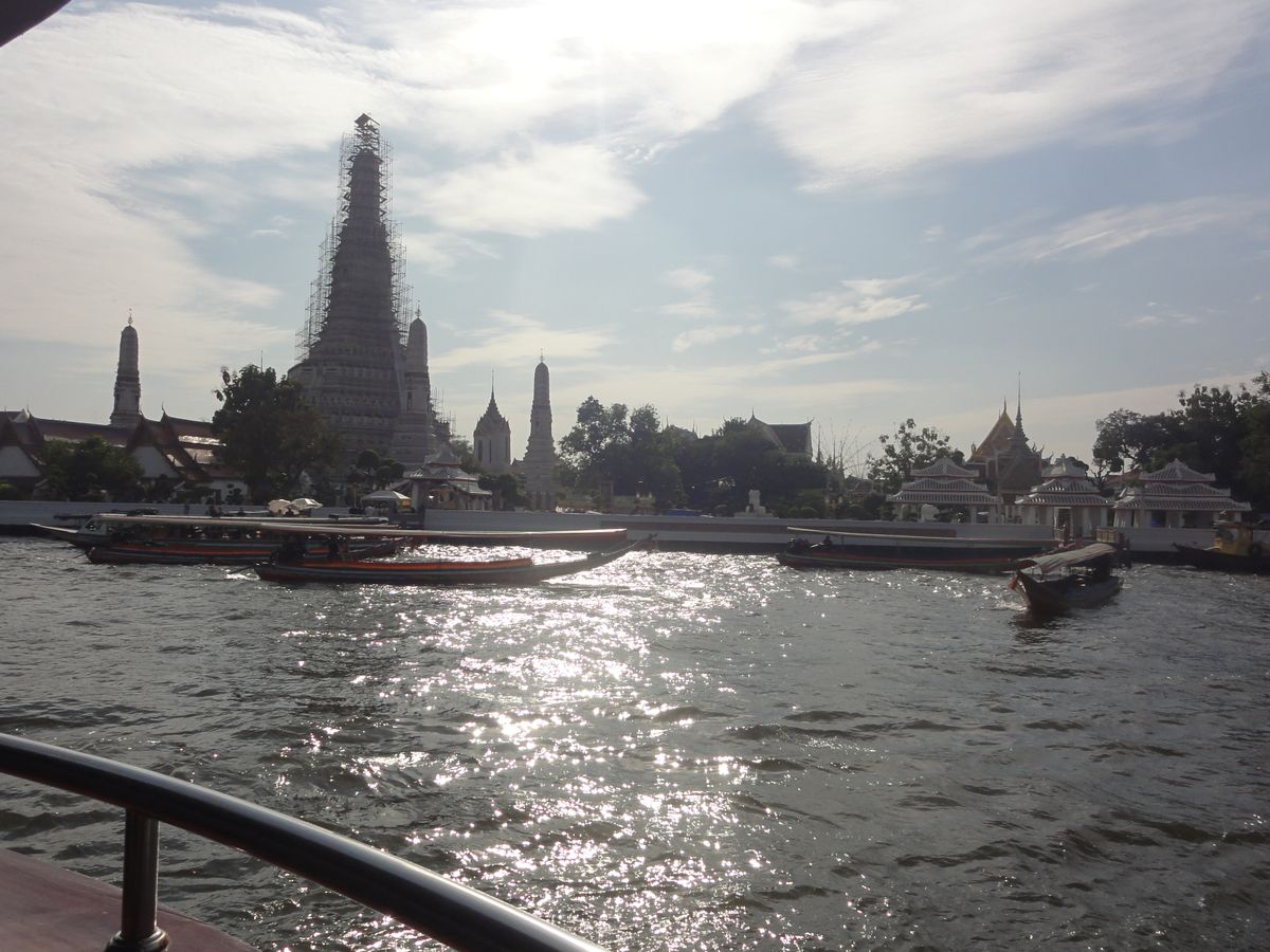 まず船内でビュッフェ・バイキングのランチ。ツアー会社がいいのか、ツアーガイドさんの気遣いがいいのか、家族毎に窓際のテーブルが確保されて、Singha Beerを飲みながら楽しいランチ。たっぷり2時間はくつろげるクルーズなので、ハウスワインの赤をボトルで注文。デザートのチョコレートケーキも美味しい。ワイングラスとワインボトルを持って、さぁデッキへ。やわらかな風が気持ちよい。デッキにもテーブルと椅子が置いてあるので、ゆっくりと流れる景色を見ながらワインをいただく。(なおデッキは風があるので喫煙可、愛煙家はよりリラックスできる。)水上の風景は寺院、オフィスビル、水上生活者の家など新旧の景色が重なり、あるいは入れ替わる。ゆったりと流れる至福の時間でした。