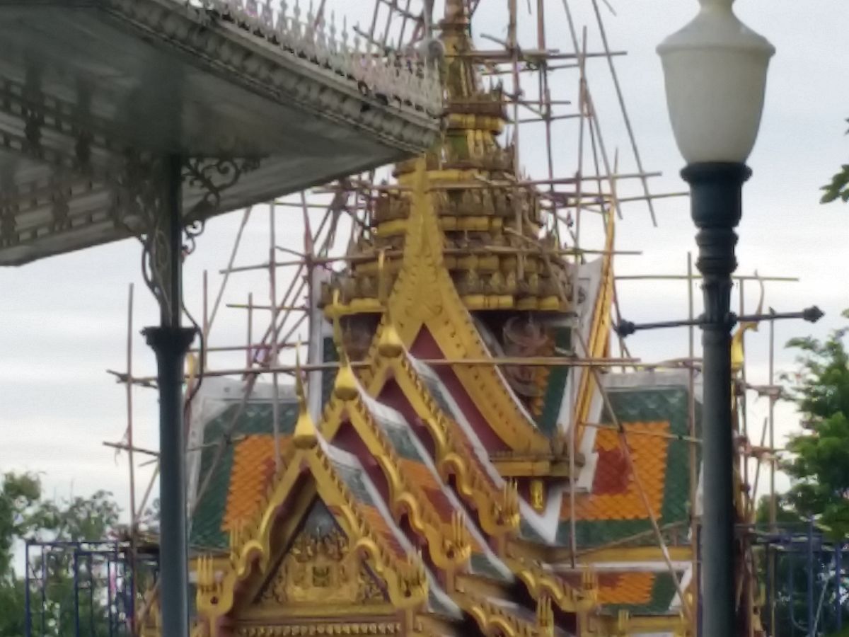 5月末、前日の水上マーケット観光ツアーの暑さから回復した早朝6時、同じようにホテルに集合してそのツアーは始まりました。その日は我々だけの貸切となり、やはり冷房の効いたワゴン車で北へ向かうこと1.5時間、まずはバンパイン宮殿で下車です。広い敷地の中をゆっくり歩いて観光しました。特筆すべきは、中国から取り寄せしたという象嵌が施された家具などの調度品。どれも贅を尽くした品々でした。その後涅槃像や寺院、木の根に抱かれた仏様の頭などアユタヤの定番ともいえる観光地を足早に移動していきました。途中象の背中に揺られ市街地を散策。象の背中は意外と高いんだという驚きがありましたが、それよりも揺れがひどく乗り物酔いになりそうになり、最後は早く降りたい気分でした。