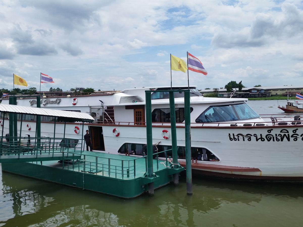 ディナークルーズの時間が近づくと、いろんな国籍の方々が集まって来て早くも凄い盛り上がりになりました。実は夕方までのアユタヤ遺跡ツアーを申し込んでいて、ホテルに戻ると移動だけで2時間くらいロスするところだったのですが、ガイドさん、ツアー会社さんの粋な計らいで桟橋に直行してくれました。本当に助かりました。乗船時間まで周りの散策、モールで買い物、マッサージとここでも満喫。大きな船が桟橋に横付けされると船上のキャストさん達が踊りでお迎え。ガイドさんの丁寧な案内で席に案内されるとすぐに歌が始まった。船上からの夜景は最高!周りの方々とも友達になって楽しく食事をしていると、ステージで踊り出す人も。最初は数人でしたが、最後はステージから溢れていました。途中、スコールにあいましたが船員さん達が素早くビニルでシールドしてくれて濡れることも無く安心してお腹いっぱい食べられました。もちろん送迎付き。桟橋のモールのショップ、穴場のマッサージ店もあり。このツアーはオススメです。