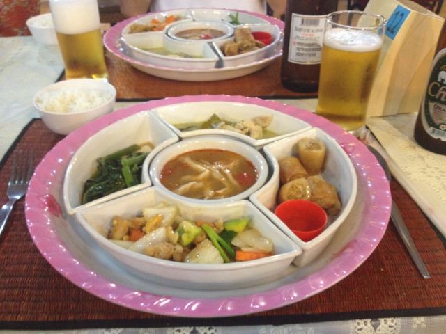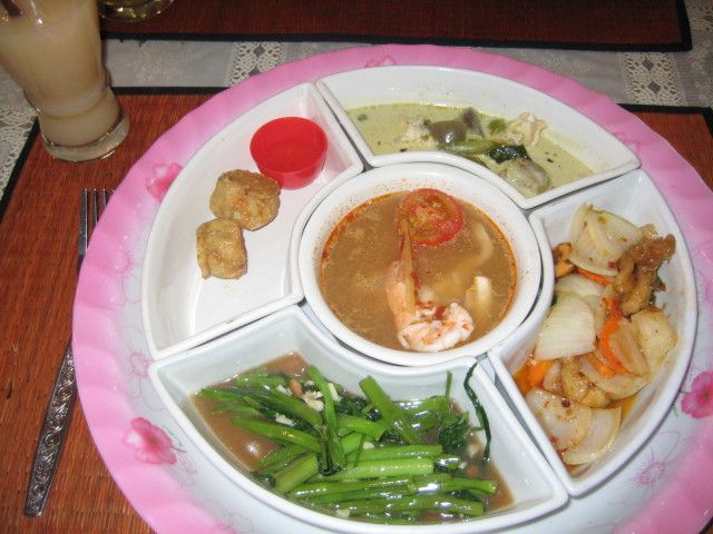 夕食はタイ料理の定食みたい。トムヤムクンや春巻きなどおかずが4,5こプレートに乗っていて、ご飯が別容器でだされました。味は微妙、私には合わない感じでした。