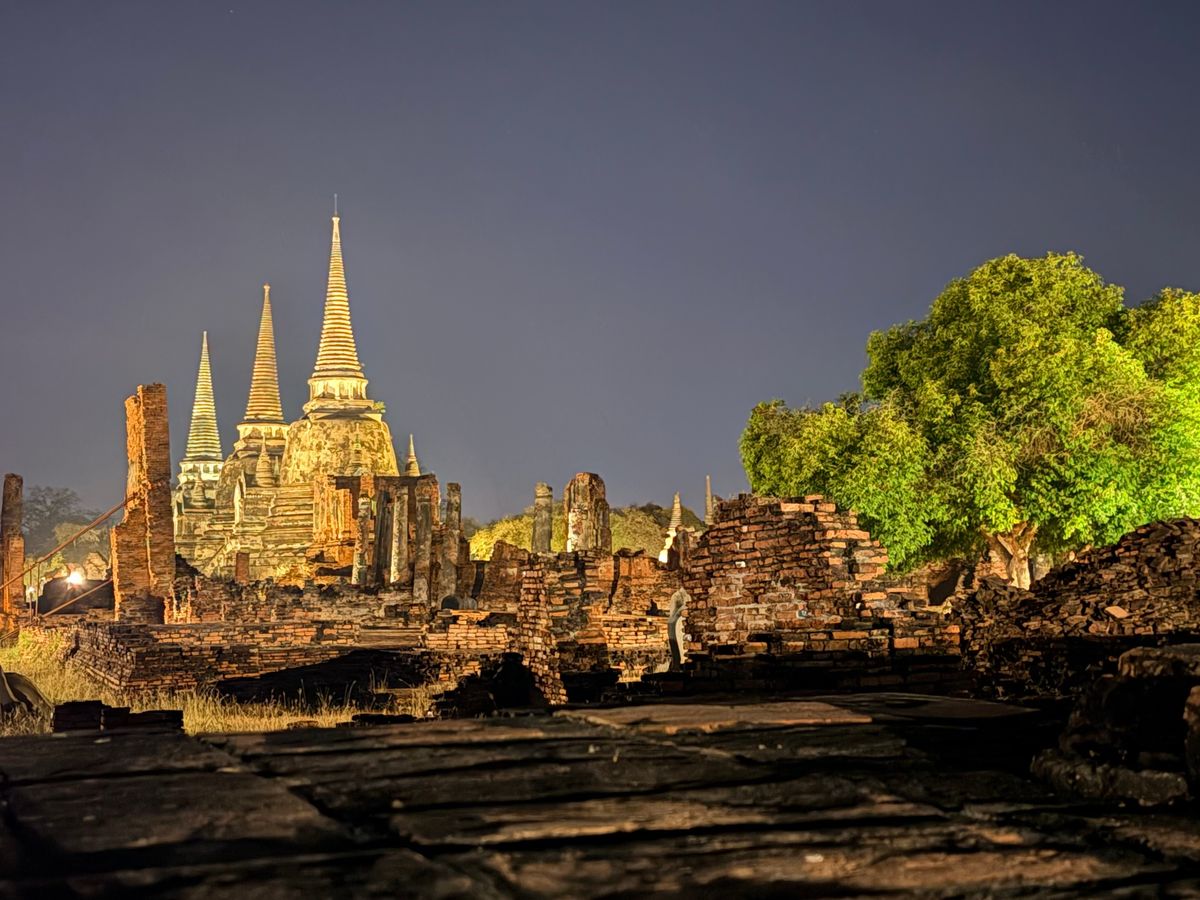 ガイドのサオさんのおかげで楽しく観光出来ました。夕方のまだ明るい遺跡巡りもでき、夕暮れのアユタヤを楽しみしんだ後に食事。その後は遺跡内に入場こそ出来ませんが外からライトアップされた遺跡を見ることが出来ます。同じ遺跡を昼と夜どちらも楽しめ満足でした。サオさんのスマホでも沢山写真を撮ってLINEで送って頂けました、ありがとうございます