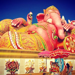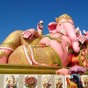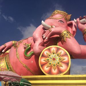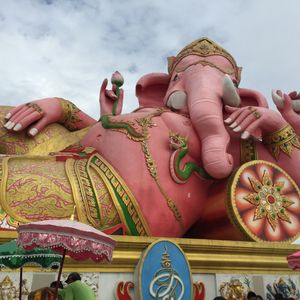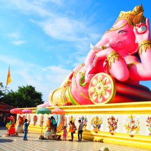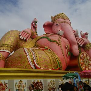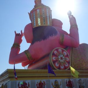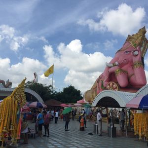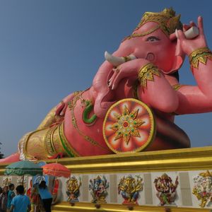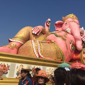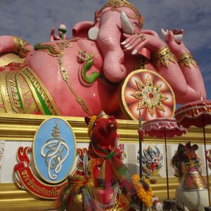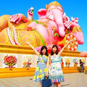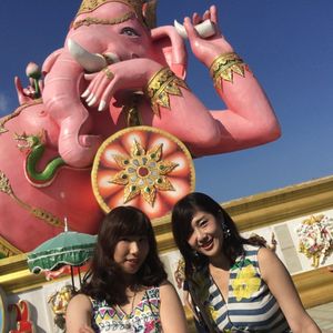 友達と二人で参加しました。バンコクは友達は初めて、私は来たことあったので一般的なツアーでは行かないようなところに行きたかったので友達と相談して決めました。 朝早い出発でしたが午後の割とはやくに終わるためそれからの時間を有効に使えました。ツアーでの車に乗っている距離はかなり遠くに感じたので自分たちでは行くことができないとおもいました。大きなピンクのガネーシャは想像以上に大きく、びっくしりました。日本人を含め外国人の観光客もほとんどみかけませんでした。仏像や龍や蓮の花などはとても大きかったですし、そのほかネズミの像やサングラスをかけたお坊さん?の小さい像など、テーマパーク??のようでした。私もガネーシャとお話ができるというねずみさんの肩耳をふさいでお願いをしました。ガネーシャの周りにねずみさんが何体もいますがガネーシャさんに直接お話しできるのはガネーシャに向かっている白いねずみさんだそうです。