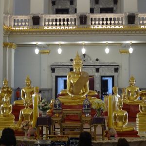 お寺に入ってすぐ、ガネーシャの後姿が見えます。さすが圧巻の大きさ。前に回るとその有難い姿がお目見え!そして、ガネーシャを取り囲むように従者のネズミが沢山います。曜日毎に色が分かれたネズミが7体。特に重要なのが、ガネーシャに顔を向けた金と銀のネズミ。この2体(特に金ネズミがタイ人に大人気)が願い事を伝える役目を持っているので、我が家もタイ人に倣って金ネズミに耳打ちしました♪また注意事項があって、願い事を伝える時に逆側の耳を手で押さえないと願い事が聞き流されるそうです。ご注意を。