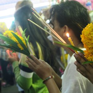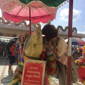 いったん外に出て、「ルアン・ポー・ソートーン」が祀られている部屋でもお祈りや金箔をはりたかったのですが、あまりの人の多さに、断念。入口では、願い事がかなった人向けの奉納舞踊が行われていました。休みなく踊られているということは、それだけ、願い事がかなった人がいるということ。