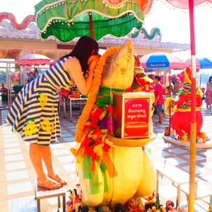 次はメインのピンクのガネーシャ像。ピンクのガネーシャ像のあるワット・サマーンには他にも色とりどりの仏像があり、落ち着いた寺院に慣れている日本人にはテーマパーク?とも思えるような場所です。ただ現地の方々が徳を積むため、魚に餌をあげたり、お供え物をしたりしているのが、間近で見ることができます。