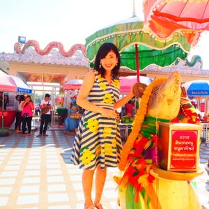 最初に訪れたのは、タイ人で知らない人はいないと言われるほどのパワースポット、ワット・ソートーン寺院。8:30頃到着して30分程の観光をしている間に、続々と現地の方が参拝に。週末は凄く渋滞するほどの混雑だというのも頷けます。