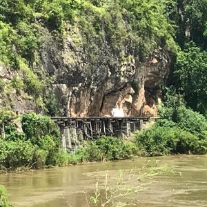 カンチャナブリはバンコクからすごく遠いので、このツアーで行ってよかったです。象乗りは、とても印象的でした。象の背中から見下ろす緑は、気持ちよかったです。いかだから見える、川に迫り出すような原生林のジャングル、鉄道の車窓から見える土色の水が朗々と流れる大きな川。今まで見たこともない景色に圧倒されました。お昼のバイキング、期待していなかったのですが、食べやすく、美味しかったです。橋は、観光客で一杯で、少しがっかりでしたが、何より、バンコクで市内とは違うタイの自然に触れられます。他社のツアーで、カンチャナブリに行くものもありますが、象乗りなどと組み合わせがあるので、よかったです。バス移動が長いですが、場所を考えれば仕方ないです。これから行く方、運動靴で行ってください。洞窟も象もいかだもヒールでは大変です。