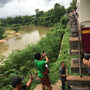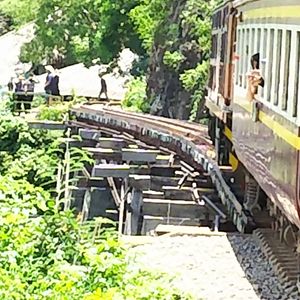 カンチャナブリからローカル鉄道で、進行方向左側に座りやがて鉄橋に、スローペースで進み、その後の崖淵の橋梁が今も木造で、機関車がその上をゆっくりと走行するのには、驚きで有りメンテナンスの良さには驚いた。