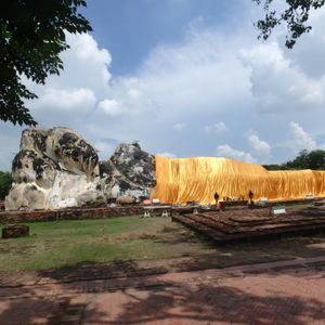 9月末、タイでは雨期の終わりになりますが、アユタヤへのモニターツアーに行ってきました。タイトル通り盛り沢山の内容で、早朝7:00頃にホテルを出発し夕方6:00頃に帰着です。ツアーバスはハイエース12人乗りで、客8名+運転手とガイドさんで10人乗車と結構窮屈です。水上マーケットはバンコクの南西に位置し、アユタヤはバンコクの北にありますので走行距離が相当長く、その分各地の滞在時間が削られます。象乗りはアユタヤ遺跡の寺院跡に作られたエレファントキャンプにあり、小さなふれあい動物園の雰囲気でした(有料ですが、ニシキヘビやトラとの「ふれあい」もできます)。水上マーケットは最初に8人乗りの高速ボートに乗り、そのあと有料ですが船頭手漕ぎ4人乗りボートに乗り換えて水上マーケッを見学します。水上マーケット価格は非常に高いのでガイドさんから1/5価格ぐらいに交渉できると聞いていました。私は食べ物だけを買いましたが、同乗した人は頑張って価格交渉していました。正直、水上マーケットより高速ボートの方がスリルが有って面白かったし、高速ボート乗り場の木彫り職人さんの仕事に見とれてしまいます。その後、バンコク市内のホテルにて昼食を食べ(いろいろ選べ、結構おいしかった)、アユタヤに向かいます。途中トイレ休憩もかねてココナツファームに寄り、アユタヤに到着です。アユタヤ遺跡は2つの河川に囲まれた広大な島状の平地で、中世にビルマ軍との戦争で破壊されたのち修復が出来ていない寺院跡がいたるところに有ります。ツアーでは主要な遺跡の中の3つの寺院と、修復が進み僧侶が生活する美しい寺院に案内していただきました。ガイドのポーさん(女性ですが、本名が長く覚えられないのでポーさんと呼んでいました)は日本語がうまく、またタイ仏教の研究をされていたとのことで、アユタヤ遺跡の寺院についてとても詳しく教えてくれました。最後に訪れた白い涅槃仏寺院ではお参り作法も伝授され、その通りにお参りしましたよ。9月末のタイは 昼間は晴れ又は薄曇りで蒸し暑く、夕方から激しい雷雨になる事が多いようです。ツアーの服装はTシャツ・短パン・サンダルでOKですが、アユタヤでは相当歩くのでスニーカーがお勧めです。ツアーバスに荷物や購入したお土産などを放置できるので、行動の荷物にはなりません。雨傘はツアーバスに用意されていました。バンコク市内は日によって相当な渋滞が発生するようで、帰りの到着時間はその時の交通事情により1時間ぐらい前後するらしいす。ちなみに我々は渋滞には会わずにラッキーでした。