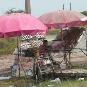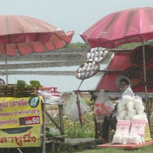 水上マーケットのあるダムヌンサドゥアックとアユタヤ遺跡は全く違う方向にあるため、他の方たちも書かれているように移動距離はかなりあります。タイ初めての私にとっては車窓からの景色もそれなりに楽しめました。ダムヌンサドゥアックに向かう途中、広やかな塩田が続き塩を売る人の露店があちこちに見られました。(写真)水上マーケットは市場というよりはお土産やさん巡りという感じなのでロマンを求めて行くとガッカリかもしれません。でもそこに行くまでのボートでの30分の移動はけっこうワクワクし楽しめます。アユタヤ遺跡は、まあこんなものか。象乗りする場所は「ザ・観光地」といった雰囲気です。とはいえ一度は訪れるべき二大名所を1日で効率よく低料金で巡れるこのツアーは時間の余裕がない方にお薦めです。