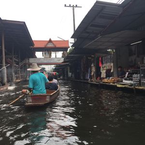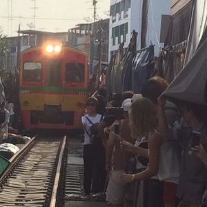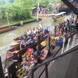 少し早めに待機して場所を確保した方が良い写真が撮れるかと思います。他国の観光客が電車スレスレのところに陣取っていましたが、お店のオバサンに注意されていました。その後、ココナッツファームでトイレ休憩の後、水上マーケットへ。初めにモーターボートにてマーケットに行き、希望者のみ手漕ぎボートへ追加料金を払って乗りました。マーケット自体はお土産ものばかりでしたが、ココナッツアイスを購入して食べました。さっぱりして美味しかったです。マーケットで売られてる商品は高く設定されているので交渉した方がよいかと思います。マーケットの後、車でタイラーメンのお店へ行きました。素朴で美味し買ったです。早朝出発のおかげで、1時半にはホテルに戻り、午後もショッピングに出かける事ができ、充実した1日になりました。