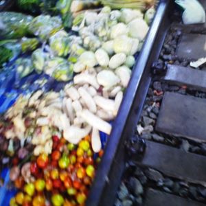 線路市場では普段スーパーでパック詰めされたお魚やお肉しか見てない子供にとって、お魚一匹が大量に置かれていたり、お肉の塊を見て驚いていました。電車が来ると、「写真写真」と肩車されながら夢中で撮っていました。
