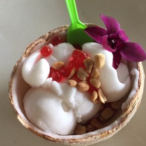 水上マーケットに降りるとお土産やさんがあり、食べ物を売ってる場所もありました。私はなぜかボートに乗ってるときから、ココナッツアイスクリームを売ってるおばちゃんと目が合って、手招きされていたので、ボートを降りた途端、吸い込まれるようにそこのおばちゃんのところに行って、アイスクリームを買いました。とっても美味しかったです。ココナッツが苦手だから、自分はいらないと言っていた主人も、一つしか買ってないのに、美味しいと言ってやたら食べてました。オススメです。
