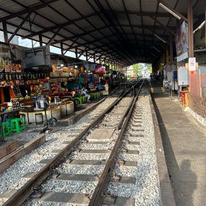 メークロン線路市場:市場でのんびりするというよりも、迫ってくる電車を見るという感じ。市場は広くて、中に入るとかなり魚のにおいがきつかったです。さばいている血が白のバンツに飛んできてたので、薄い色の服はやめといたほうがよいと思います。