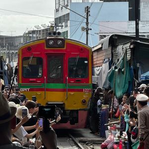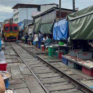メークローン鉄道市場は、過ぎ去る電車と一瞬で元にもどる市場の様子を間近で見ることができて圧巻でした。「(象柄の)タイパンツもここで買うといいよ!」とおすすめされ、100バーツで買いました。