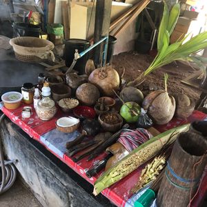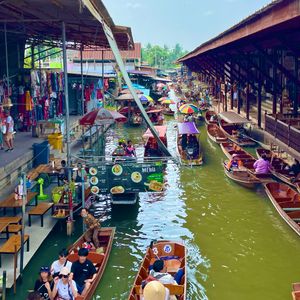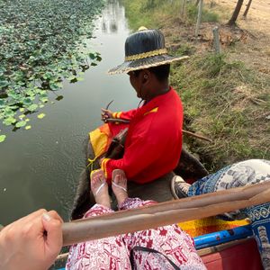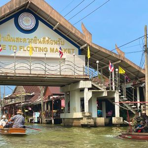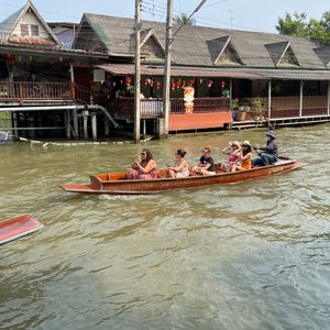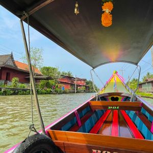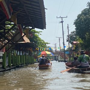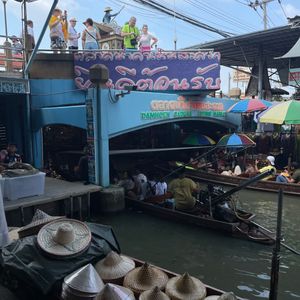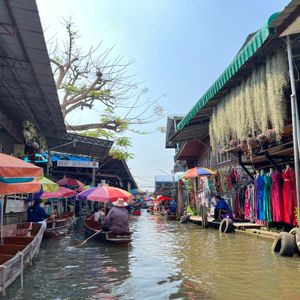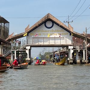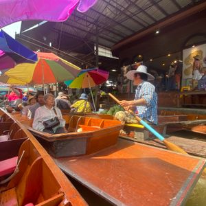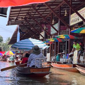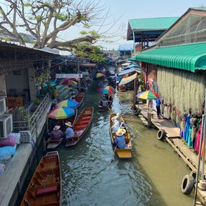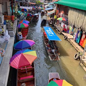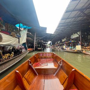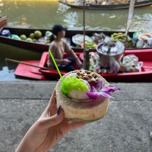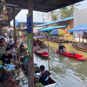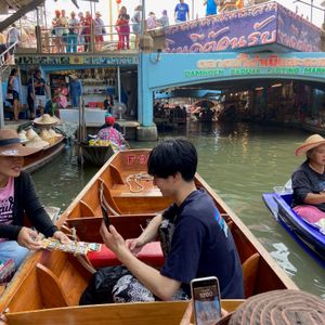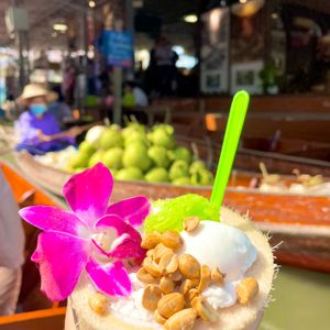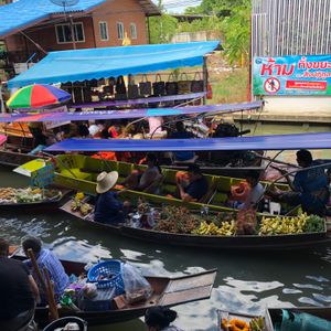 水上マーケットには10時過ぎに到着。心なしか売り手の小舟が少なく観光ボートが多い印象。もっと早い時間に行けばまた違うのかも?好きな時間に行けるのはツアーでは出来ない自力で行く良さかも。事前に調べていたココナッツアイスを購入。あとは、一番栄えた所を過ぎた後に、明らかに手漕ぎボートの漕ぎ手のおばさんと手を組んでる(夫婦かな笑)んだろうなと思われるおじさんのお店の前にボートを停められて、ひたすら色んな商品を勧められた(もちろん漕ぎ手によって異なると思う)。象さんのランプを500バーツで買ったが、最初は1200バーツという高額をふっかけられた。ボート降りた後の地上のお店にも同じ商品が売られていて、そこでは最初に言われた値段が450バーツだったので、200バーツくらいまで値切れたかなと後悔。皆さんも行く時は最低でも5分の一くらいまでは値切ってみて。タイと日本の電圧が違って帰国してランプがつかなかったのもまた良い思い出。