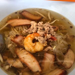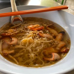 お昼のラーメンは、よくあるヒラヒラの透明な麺の汁物。普通に美味しい。