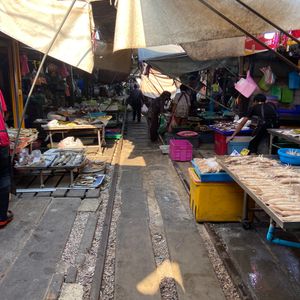 最初のメークロン市場までは1時間以上かかりました。到着するとガイドさんが、線路を通って市場の説明をしてくれました。タイ独特の魚や食べ物なども説明してくれました。特に、お茶になる葉が多数で、値段もかなり安かったです。説明が終わって駅舎に行きました。トイレは有料5バーツほどでした。列車が来るのが8時30分頃ということで、ズボンを購入したり、出店でフルーツジュースを飲みました。いよいよ列車がず~っと向こうに見えます。市場の方々はかなり寸前まで店を広げていますが、すぐさま、畳んだり下げたりして列車を待ちました。赤い線があって、それよりも後ろ側に立って列車を待ちます。見ている人達のギリギリまで列車が近づいてきました。列車はゆっくりと通り過ぎていきました。通過後にすぐ、また市場が店を開いていました。