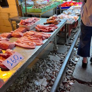 初めてのメークロン市場、線路脇のお店を見るのも楽しかったし、電車がギリギリを走る緊張感も面白かった。