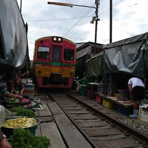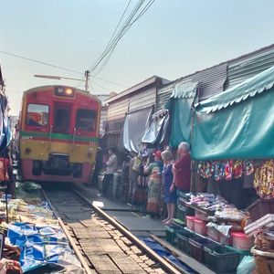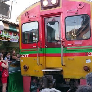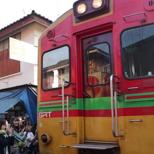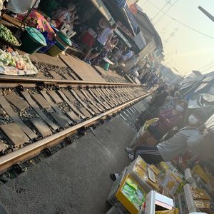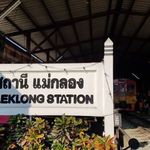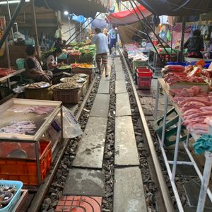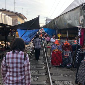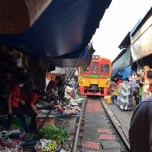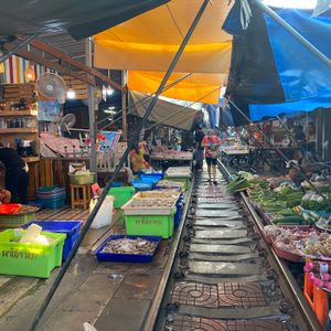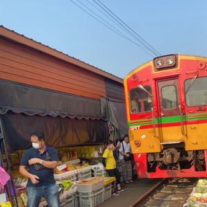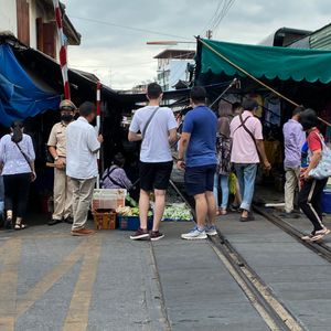 最後はまたメークロン市場に戻り、列車が市場を通過する様子の見学です。ファランを中心に多くの観光客が訪れており、ここだけはかなり密な状態になっていました。みんな撮影場所を確保するのに必死でした笑