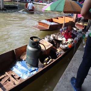 水上マーケットでは、はじめにエンジン付きの船でスピードを出して周囲を回ります。テーマパークのアトラクションのようで楽しかったです。その後手漕ぎ船に乗り、マーケットを回ります。船の上でおばちゃんが器用に料理をする姿が凄かったです。ランチ付きツアーのため買いませんでしたが、美味しそうでした。