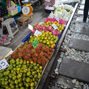 バンコクのホテルを出発して、まず向かったのがメークロン線路市場。バンコクからは約1時間で到着です。ガイドさんからおすすめの焼きとん(甘めのタレで漬け込んだ豚肉の串焼き)をご馳走していただき、それを食べながらメークロン線路市場に隣接するメークロン駅に徒歩で向かいました。この日は列車のダイヤが異なっていたようで、列車が到着するのが数時間後とのこと。とりあえずガイドさんと一緒に線路を歩きながら、線路脇の露店で売っているものをいろいろ教えていただきつつ、先に次の目的地を観光することになりました。このようにフレキシブルに観光できるのもツアーに参加するメリットの一つだと思います。