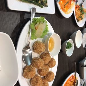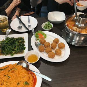 カレーだけかなと思っていたのですが、クーシンサイの炒め物やエビ団子、トムヤムクンがそれぞれ二人につき一つのラージサイズで提供されます。
