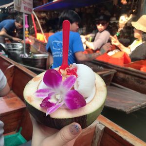 水上マーケットではココナッツの殻に入ったココナッツアイスクリームが甘すぎず濃厚ですごく美味しかったです。写真映えも◎