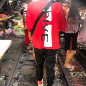メークロン市場では観光客が多く、電車が通過するときには 市場も線路も何も見えない状態でした。早くにいいポジションで待っていても 線路の中から人が溢れるてみな押し合いをしてました。