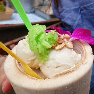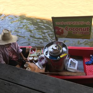 ダムヌンサドゥアック水上マーケットのボートで食べたココナッツアイスクリーム(60Baht)がすごく美味しかったです。おすすめします。