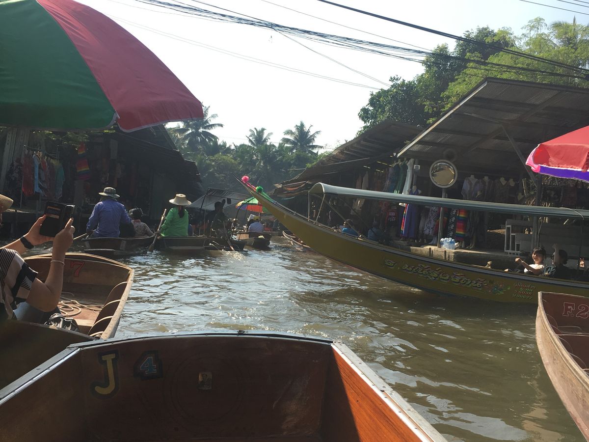 水上マーケットではボートに乗ったのですが、水路が大渋滞で、まず船着場へボートをつけられないためにかなり待たされて、乗った後は前にも後ろにも進めず、ボートの隙間に無理やり鼻先を突っ込んで、ある程度進めてチャプチャプしているうちに見学時間が終了してしまいました。