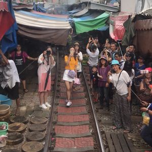 列車で線路市場へ。道にいる観光客が一斉に写真を撮り、手を振ってきて、