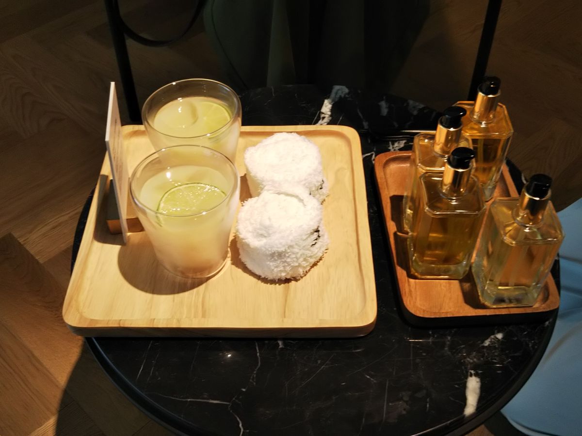 ウェルカムドリンクをいただき、4種類の中からトリートメントオイルを選び、書面にて体調の申告&施術の際の注意点をヒアリングしていただきました。