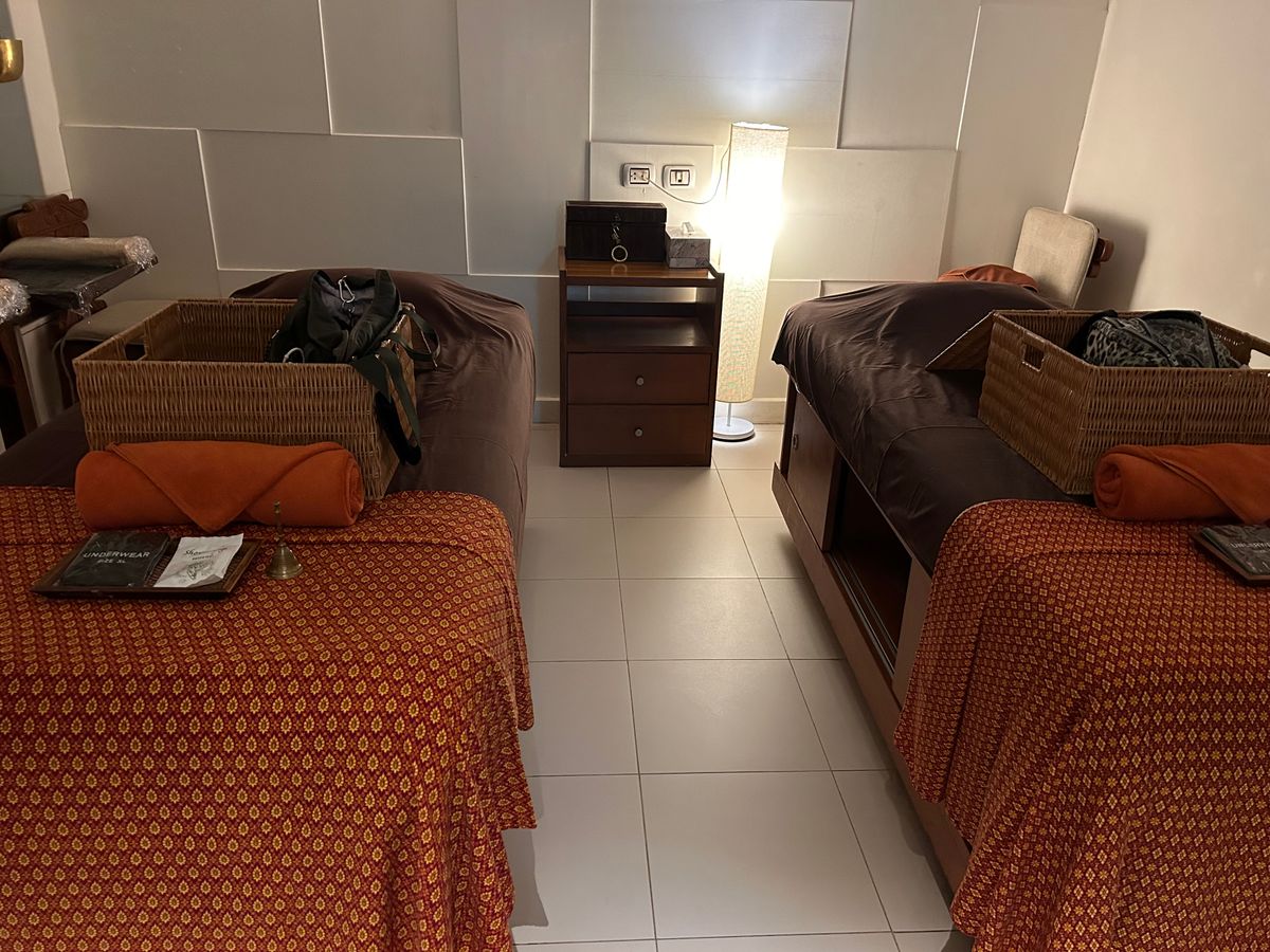 マッサージルームの温度は普通の冷房だとだんだん寒く感じると思うので、最初から温度を上げてもらった方がいいです。5:20着の飛行機でタクシーで行って到着が8:45でした。入国審査、渋滞、時間がかります。
