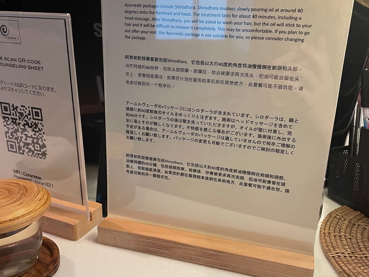 受付でQRコードを読み込んで、日本語の質問に答えて、自分の体質診断をしてもらいました。体質でオイルを変えてくれるそうです。