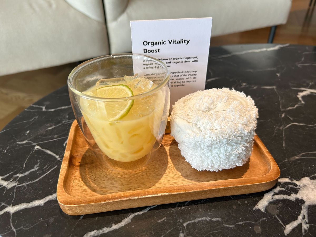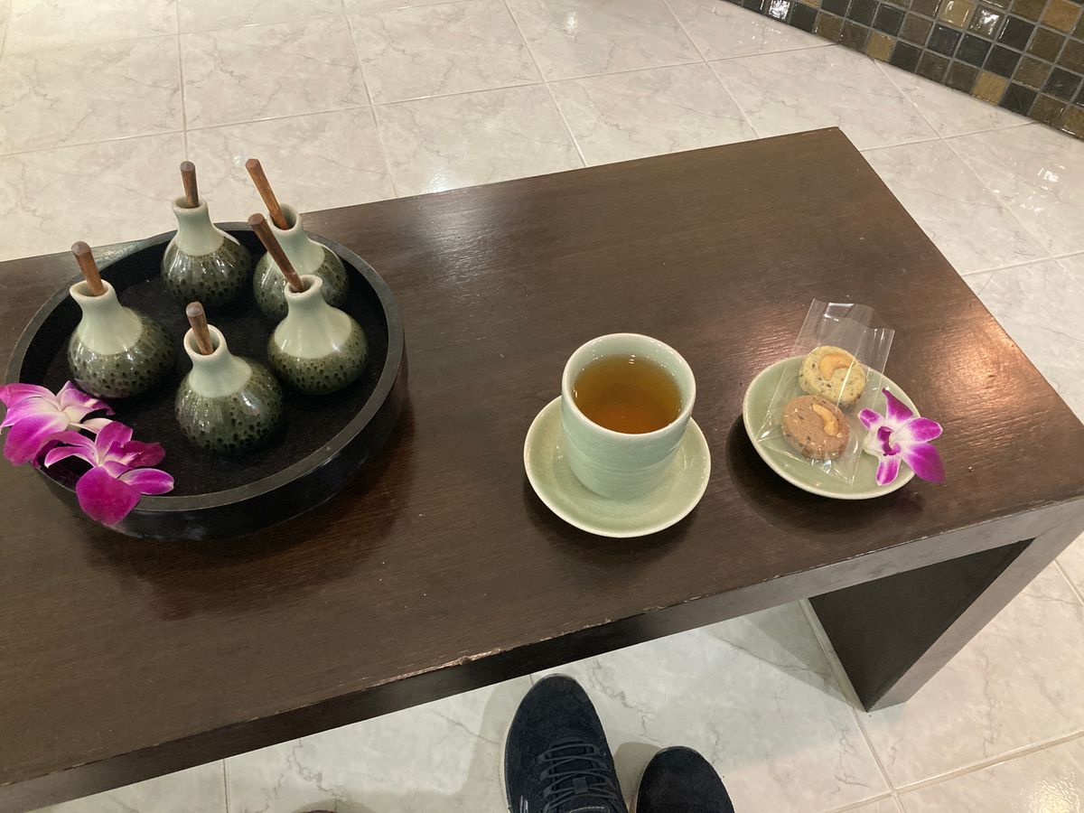 ウェルカムドリンクはハーブティー的なもので、施術後にもドリンク(バタフライピーとレモングラスだったかな?)とお菓子(カボチャとジャックフルーツ?のドライチップス)をくださいました。